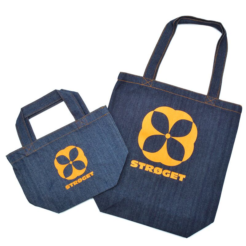 STROGETのロゴがアクセントにはいったデニム生地のエコバッグになります。